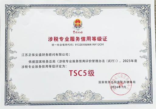 涉稅專業(yè)服務(wù)信用等級(jí)TSC5級(jí)最高認(rèn)證