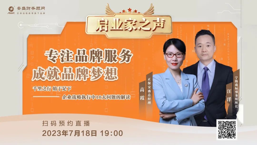 7月18日19:00,正保安盛財(cái)務(wù)推出《啟業(yè)家之聲》第三期:《【專注品牌服務(wù) 成就品牌夢(mèng)想】千里之行,始于足下——企業(yè)戰(zhàn)略執(zhí)行中10大問(wèn)題解讀》的直播訪談節(jié)目,邀請(qǐng)安盛總經(jīng)理高霞女士和寧海商標(biāo)事務(wù)所所長(zhǎng)汪洋先生親臨對(duì)話,直播間一起討論如何搭班子、定戰(zhàn)略、帶團(tuán)隊(duì),如何做好人才管理、服務(wù)升級(jí)、品牌刷新……這些問(wèn)題是企業(yè)管理中至關(guān)重要的因素,也是很多企業(yè)普遍存在的現(xiàn)象,所謂老板和員工的必聽(tīng)課。